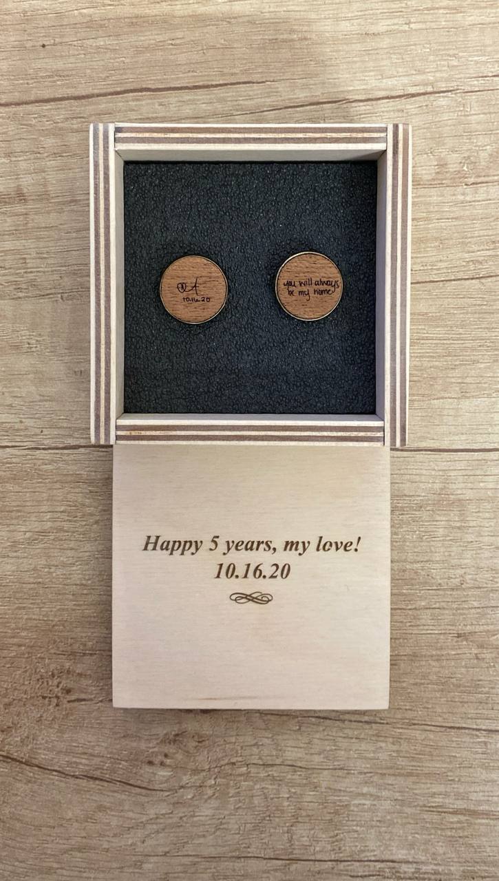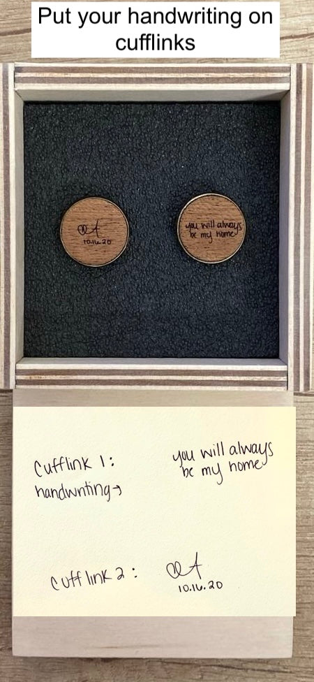Crafted from wood and brass, each pair can be engraved with initials, a date, a symbol—or even your own handwriting. Whether you’re gifting your groom, father, husband, or groomsmen, these custom cufflinks turn a small detail into a timeless keepsake.